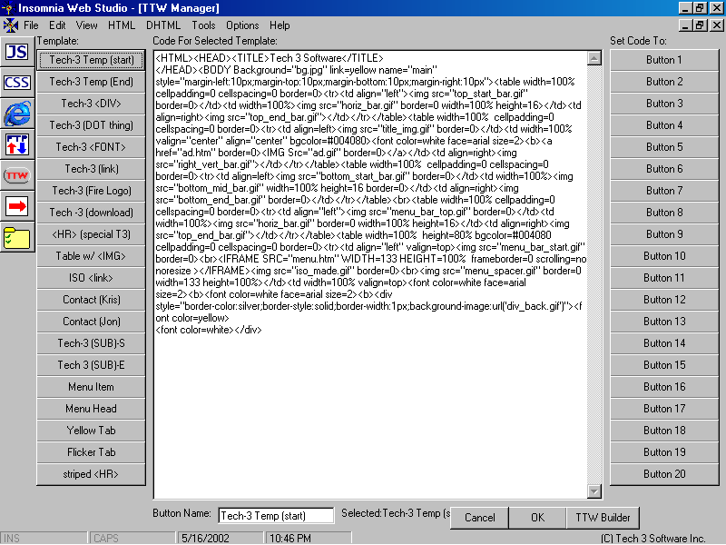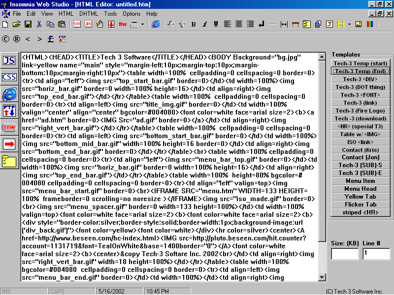 (Win9x) Complete VB Gradient ExamplesAnd Much More...... New Tech 3 Logo image whatever: Click Here! And Much More...... Web Development: New Stuff in: JavaScript, HTML, DHTML, and some graphical tricks too...- New Section on Insomnia & Web Development - TTW Download Sections too! Insomnia HTML Editor: Welcome to the world of Insomnia, our sleepless nights, and DrPepper/MtDew motivated devotion has brought you an HTML Editor to change your web development power.ISO (Short for Insomnia) is becoming really nice, with the expected release date being March we are jamming in features of the future. Check out some pictures of ISO so far: ![]() ![]() ![]() message board project |