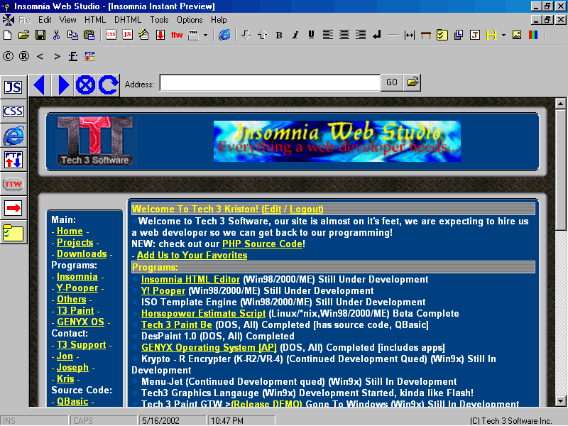Insomnia HTML Editor (Win98/2000/ME) Still Under Development Y! Pooper (Win98/2000/ME) Still Under Development ISO Template Engine (Win98/2000/ME) Still Under Development Horsepower Estimate Script (Linux/*nix,Win98/2000/ME) Beta Complete Tech 3 Paint Be (DOS, All) Completed [has source code, QBasic] DesPaint 1.0 (DOS, All) Completed GENYX Operating System [AP] (DOS, All) Completed [includes apps] Krypto - R Encrypter (K-R2/VR-4) (Continued Development Qued) (Win9x) Still In Development Menu-Jet (Continued Development qued) (Win9x) Still In Development Tech3 Graphics Langauge (Win9x) Development Started, kinda like Flash! Tech 3